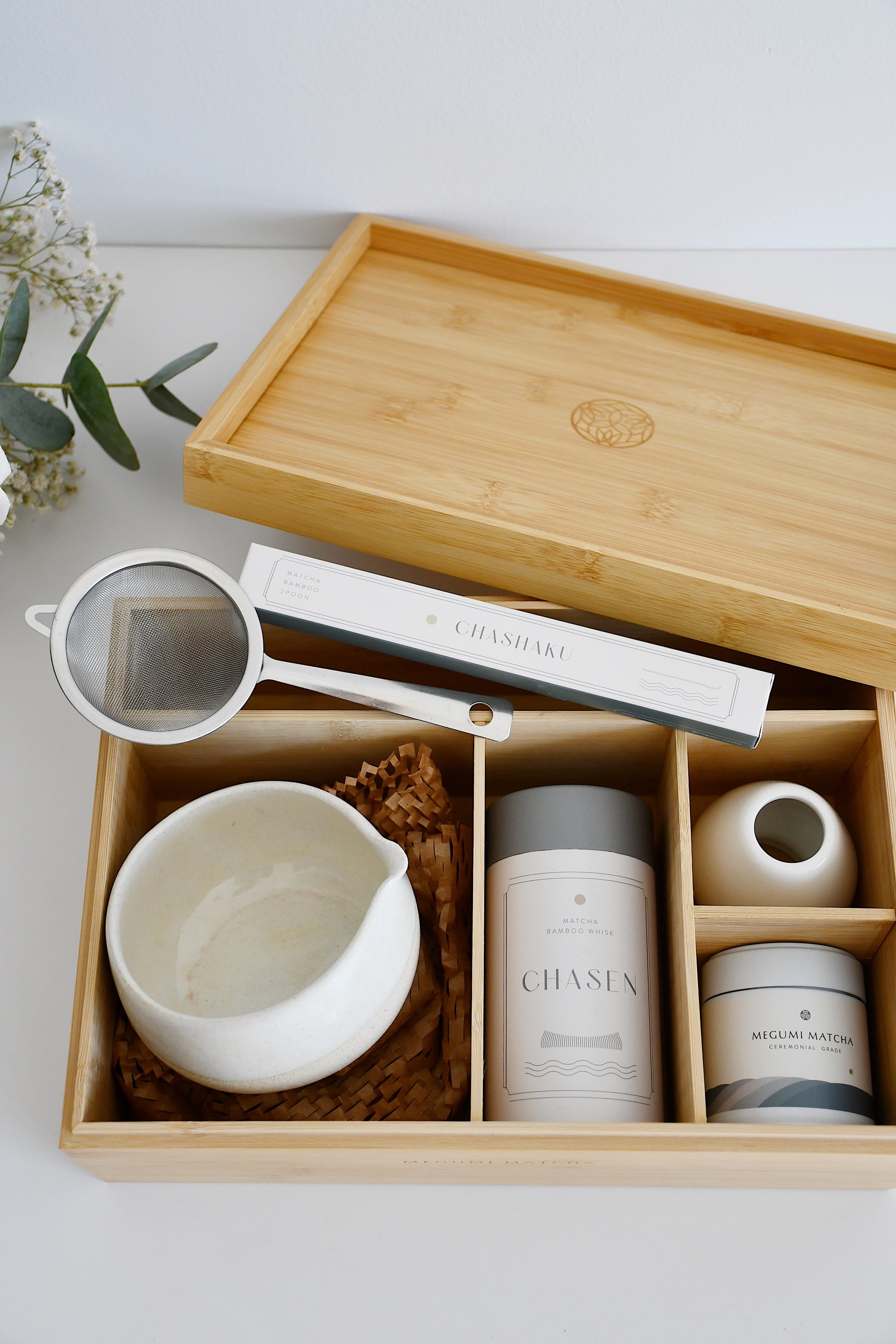 This is the perfect matcha kit in a handmade bamboo box, including all of the tools needed to make a beautiful cup of matcha.